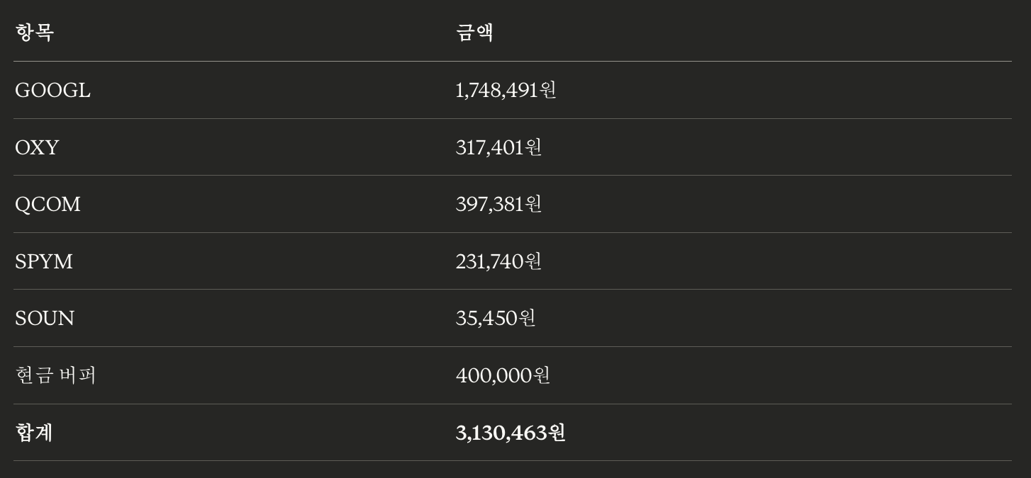 추가로, 내가 종목투자하는 섹터는 전공을 살린 AI 섹터로 지정했고, 투자 금액의 30% 이상을 밸런싱 하지 않기로 정했다. 현금 버퍼는 최소 15% 이상을 보유하기로 하고, 지금 같이 변동성이 심한 장에서는 25%까지 보유하기로 했다.