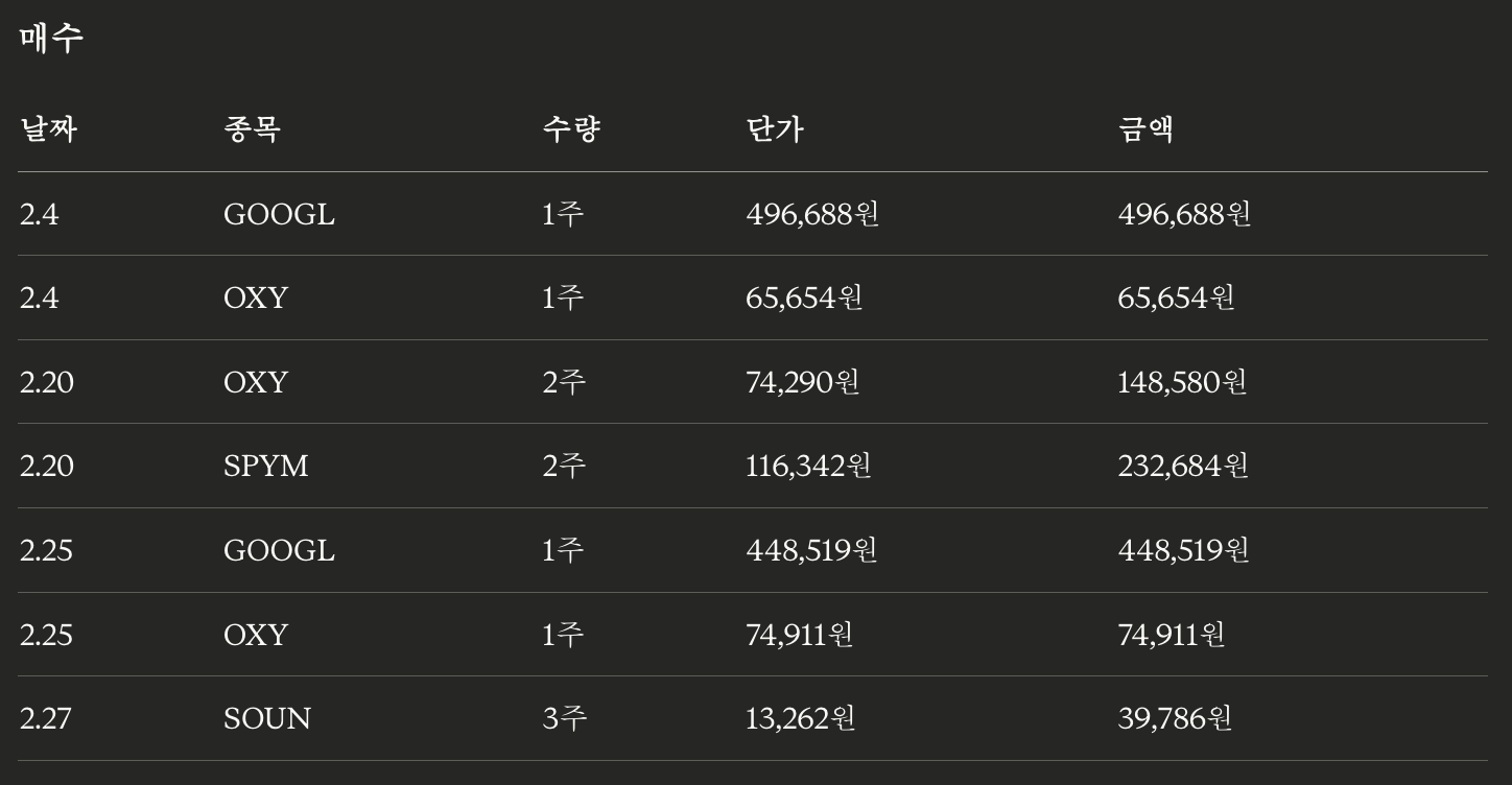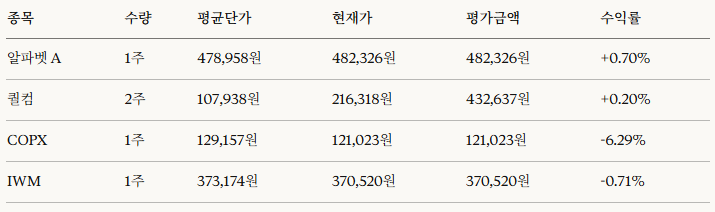 지난 1월에 토스증권을 통해 해외 직투를 처음 시작했고, GOOGL, QCOM, COPX, IWM을 담았었다. 사실 당시에 COPX랑 IWM을 매수했었는데, 2월 간 내 투자철학을 다시 수정하고, 매도 했다.