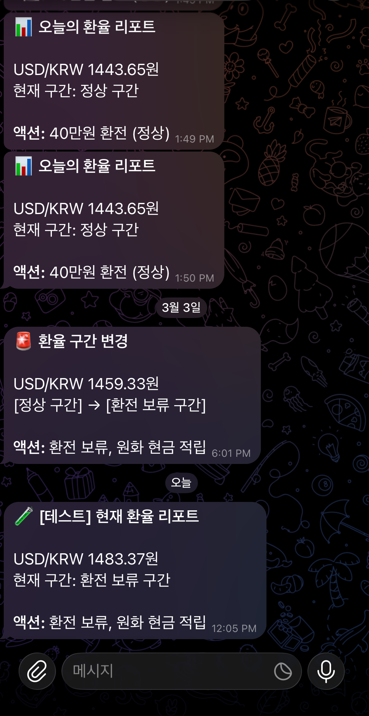 - 환율이 1,350원에서 1,380원 사이라면 그달 납입한 80만 원 전액을 환전해서 투자