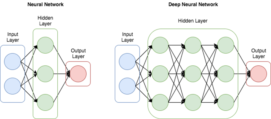 - 은닉층(Hidden Layer, 1개 이상): 신경망 내부에서 입력 데이터를 비선형적으로 변환·추상화하는 역할. 층이 여러 개일수록 더 복잡한 특징을 모델링 가능