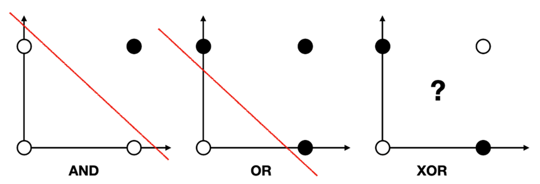 1950~60년대, 퍼셉트론은 인공뉴런을 이용하여 단순 논리 연산, 기본 분류 문제(AND, OR 등)에 성공적으로 적용되었습니다. 그러나 1969년, Minsky와 Papert의 저서 “Perceptrons”에서는 퍼셉트론이 해결하지 못하는 결정적 한계점이 증명되었습니다. 바로 XOR과 같이 선형적으로 분리되지 않는 비선형 논리 문제는 어떠한 직선(선형 경계)로도 데이터를 완벽히 구분할 수 없다는 점입니다. XOR 문제에서는, 입력값이 각각 0/1에서 1(참)일 때만 output이 1이고, 나머지는 0이므로, 점들을 직선 하나로 둘로 나눌 수 없습니다.