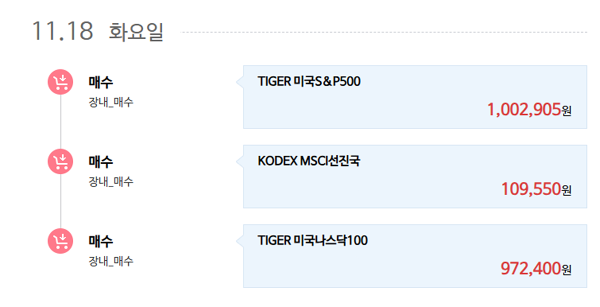 | 급락장 분할 매수 | 11월 4일, 11월 18일 | 나스닥 -2.04%, 코스피 -3.32% 급락, AI 고평가 일시적 심화 | 추가매수 여력 분할 투입 → 평균단가 약 2~3% 낮춤 |