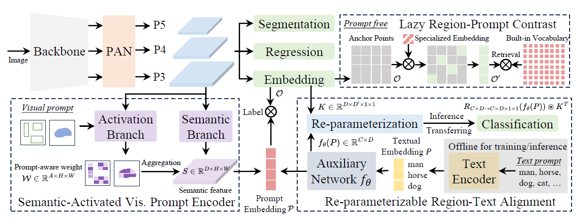 수학적으로는 $ Label = R(I ⊛ K) · (f_θ(P))^T $로 표현되며, 여기서 $ K $는 객체 임베딩 헤드의 마지막 컨볼루션 레이어 커널입니다. 학습 후에는 $ K' = R(f_θ(P)) ⊛ K^T $로 재매개변수화하여 새로운 커널 파라미터를 생성합니다. 최종 예측은 $ Label = I ⊛ K' $가 되어 원래 YOLO 아키텍처와 동일해지므로, 배포 및 하위 작업 전이 시 오버헤드가 전혀 없습니다.