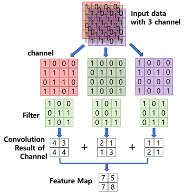 지금까지의 설명에서는 하나의 필터가 하나의 값을 출력한다고 가정했습니다. 하지만 실제 이미지는 RGB 3개 채널로 이루어져 있습니다. 또한 하나의 합성곱 계층에는 여러 개의 필터가 있을 수 있습니다. 이 모든 것이 어떻게 함께 작동하는지 이해하는 것이 중요합니다.