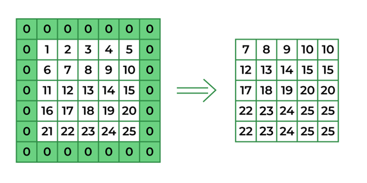 이제 3×3 필터를 스트라이드 1로 적용하면, 결과는 5×5이 됩니다. 원본 이미지의 크기가 그대로 유지됩니다.